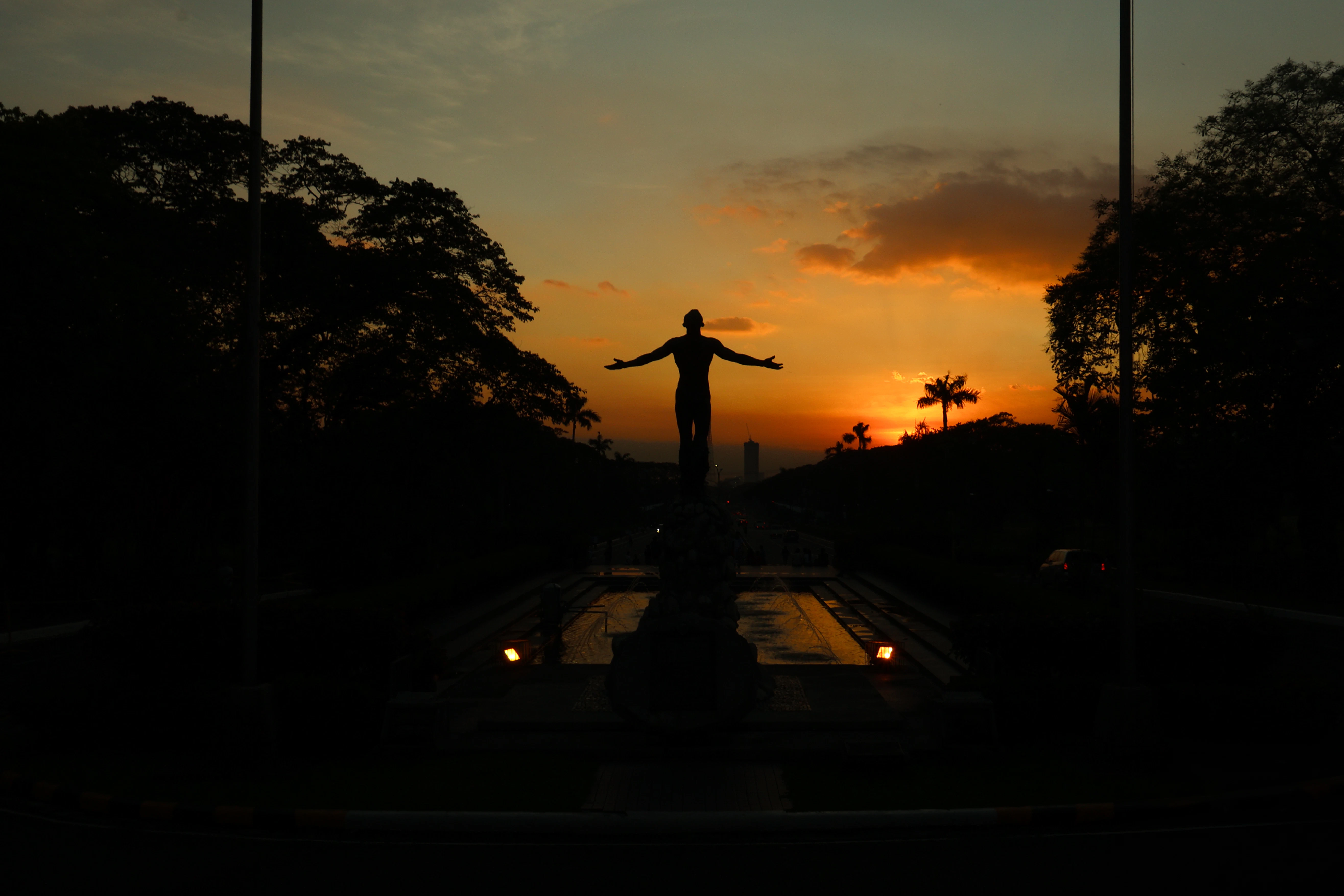 A statue silhouetted against a fiery sunset.