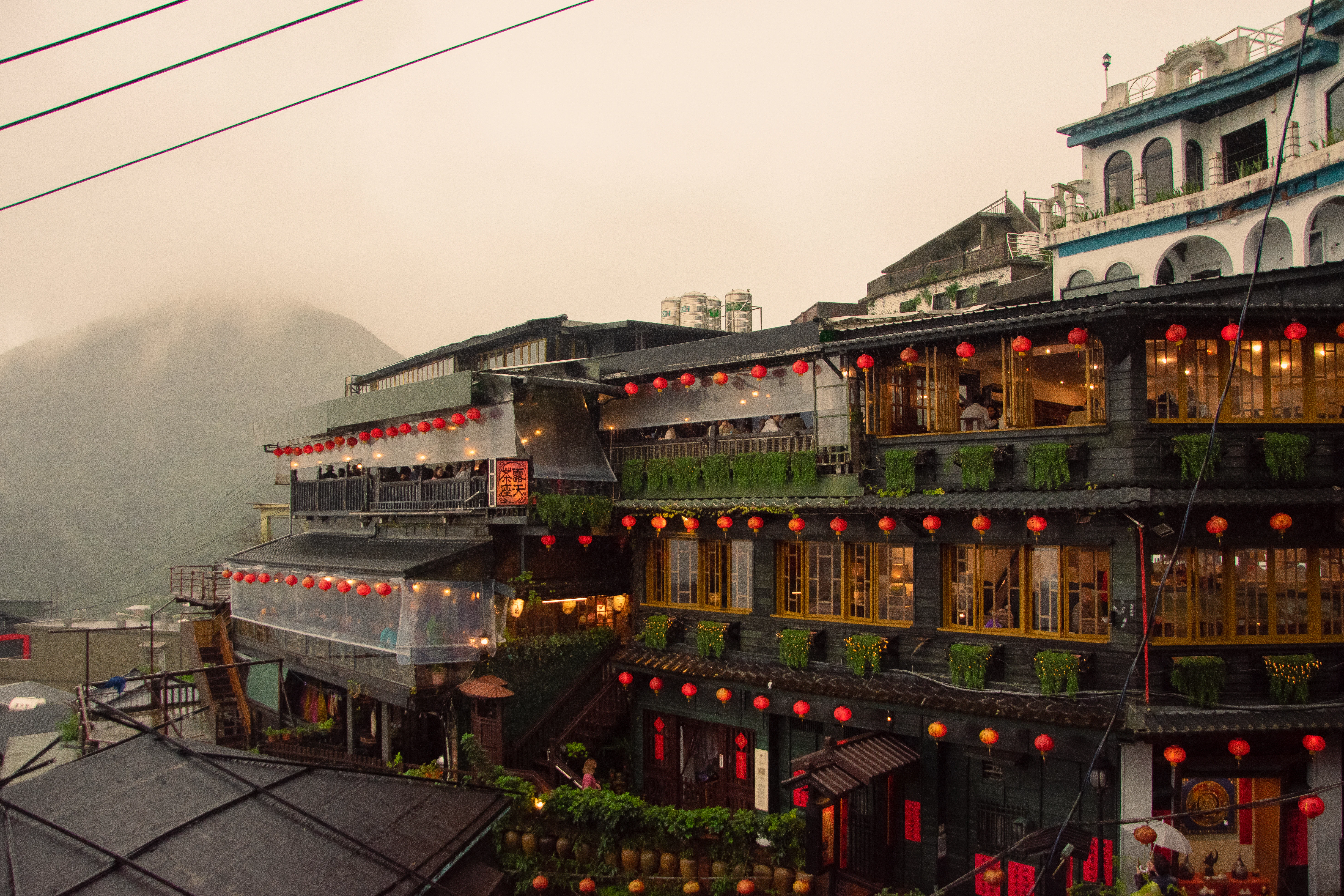 Regenschirm immer dabei — Jiufen hat über 200 Regentage pro Jahr. Leichter Regen und Nebel machen das Dorf atmosphärischer, aber eine Regenjacke ist unverzichtbar.