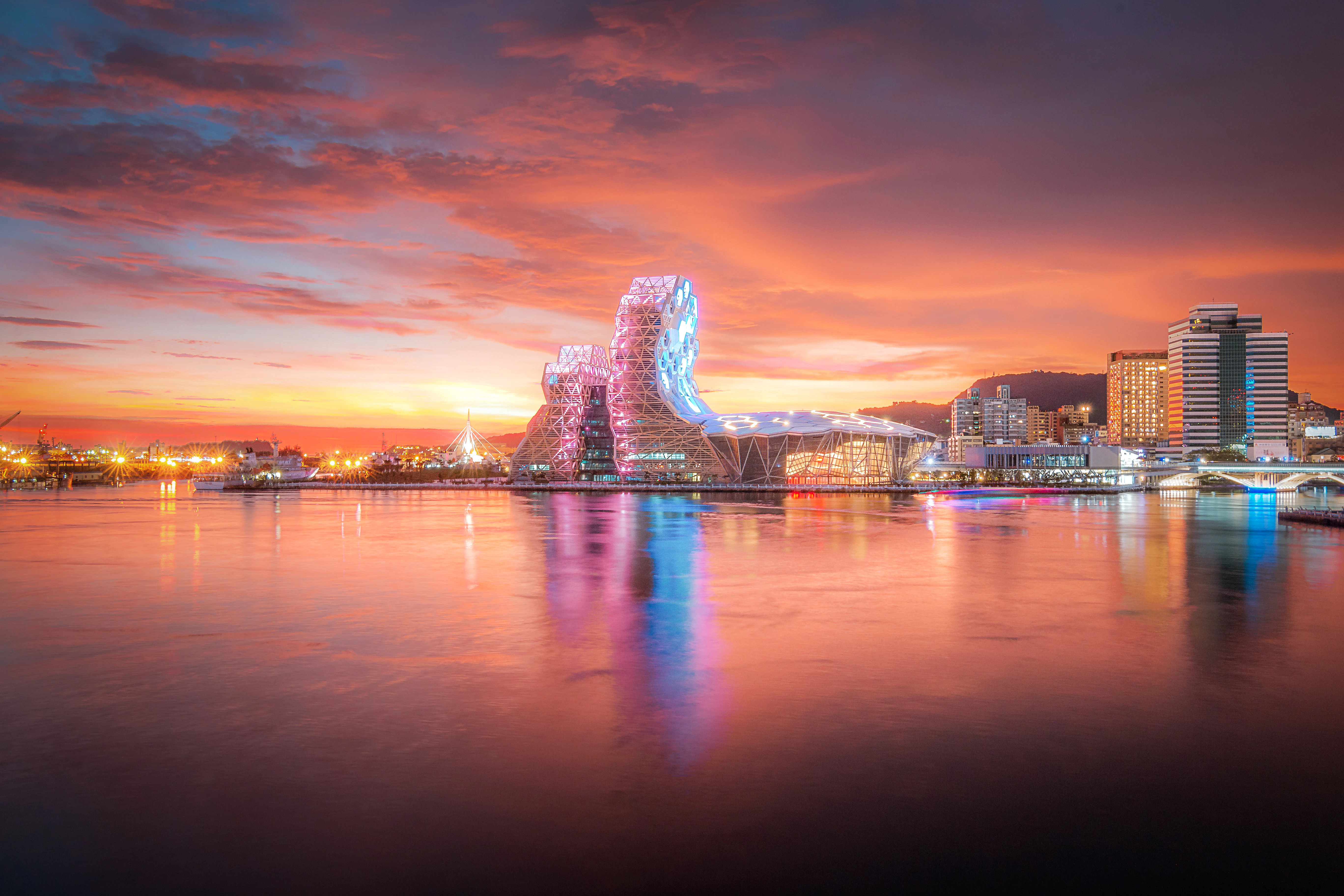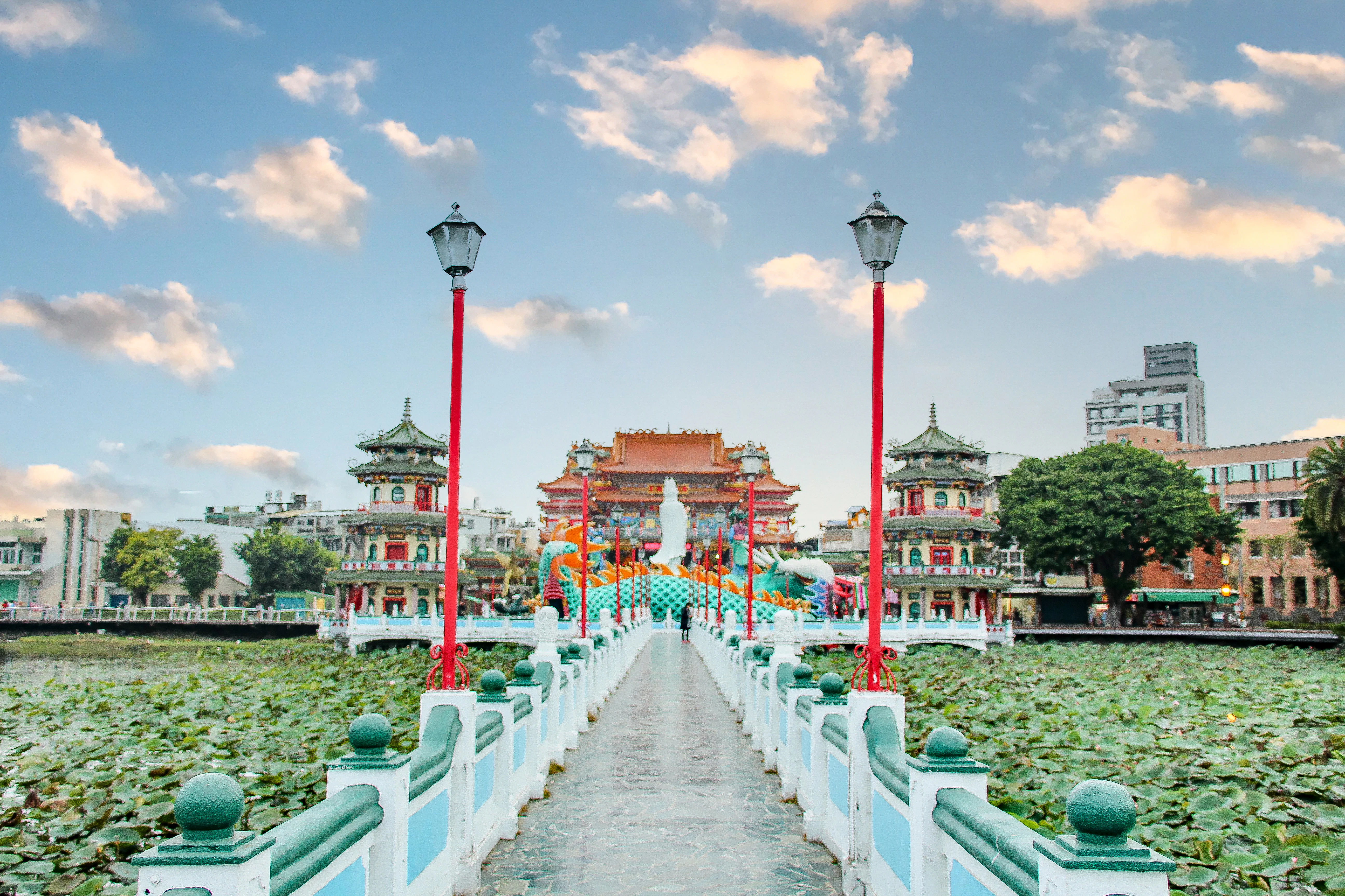 Kaohsiungs Wahrzeichen: farbenfrohe Pagoden am künstlichen See, betreten durch Drachenmaul — spektakulär bei Sonnenuntergang.