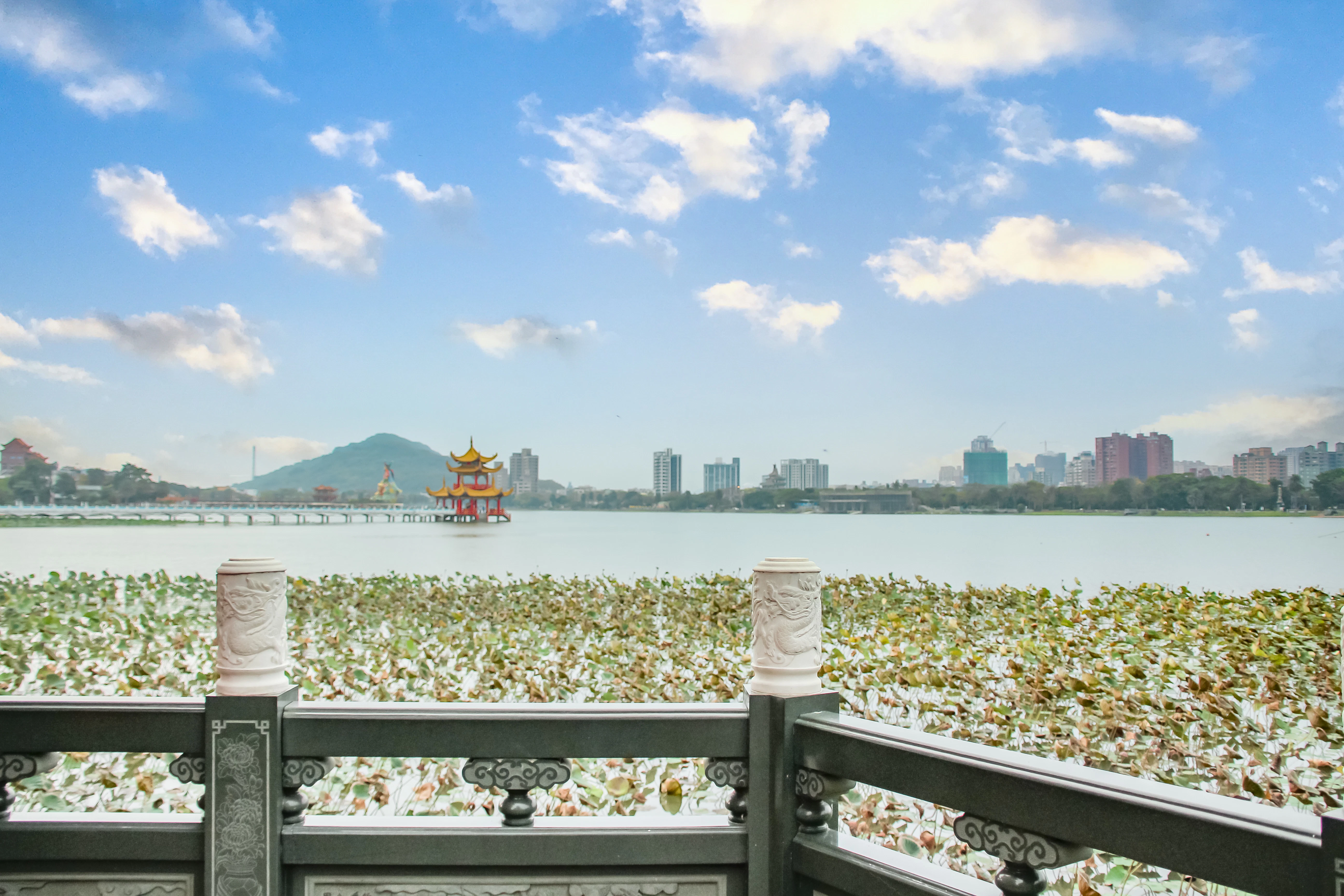 Kaohsiung ist die zweitgrößte Stadt Taiwans und der wichtigste Hafen der Insel. Die Metropole im Süden Taiwans hat sich in den letzten Jahrzehnten von einer Industriestadt zu einem modernen Kulturzentrum gewandelt — ehemalige Lagerhäuser am Hafen beherbergen heute Galerien, Cafes und Kreativräme. Der Lotus Pond (Lianchi Tan) ist Kaohsiungs bekanntestes Wahrzeichen: Der künstliche See wird von farbenprächtig dekorierten Tempeln gesäumt, darunter die Dragon and Tiger Pagodas — zwei Türme, die durch das Maul eines Drachen betreten und durch das eines Tigers verlassen werden. Daneben steht der 72 Meter hohe Spring and Autumn Pavilion. Besonders bei Sonnenuntergang ist die Szenerie spektakulär. Pier-2 Art Center ist das pulsierende Kunstquartier in ehemaligen Hafenlagerhäusern: Street Art, Installationen, Galerien und Kreativmärkte ziehen Künstler und Besucher an. Die Kaohsiung Music Center am Hafen, ein architektonisches Meisterwerk, ähnelt einem Wal, der aus dem Wasser auftaucht. Der Liuhe Night Market ist einer der berühmtesten Nachtmärkte Taiwans: Hunderte Stände bieten Meeresfrüchte, lokale Snacks und frisch zubereitete Gerichte. Cijin Island, eine vorgelagerte Sandinsel, ist per Fähre in 5 Minuten erreichbar und bietet frische Meeresfrüchte direkt am Strand, einen historischen Leuchtturm und den Cihou-Tempel. Das Fo Guang Shan Kloster, 30 km nordöstlich, ist das größte buddhistische Kloster Taiwans mit einer 36 Meter hohen Buddha-Statue und dem beeindruckenden Buddha Memorial Center.