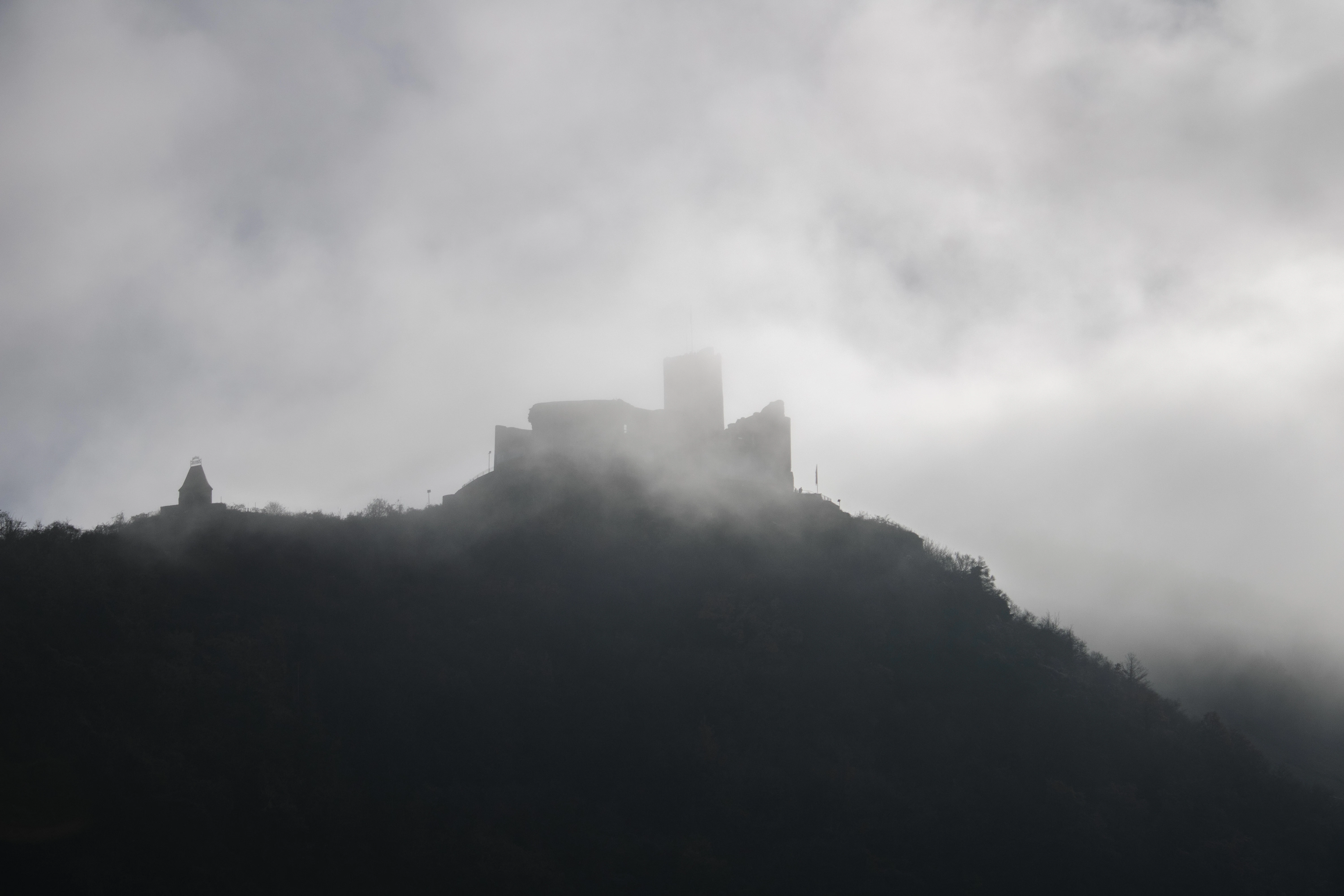 a castle on top of a hill in the fog