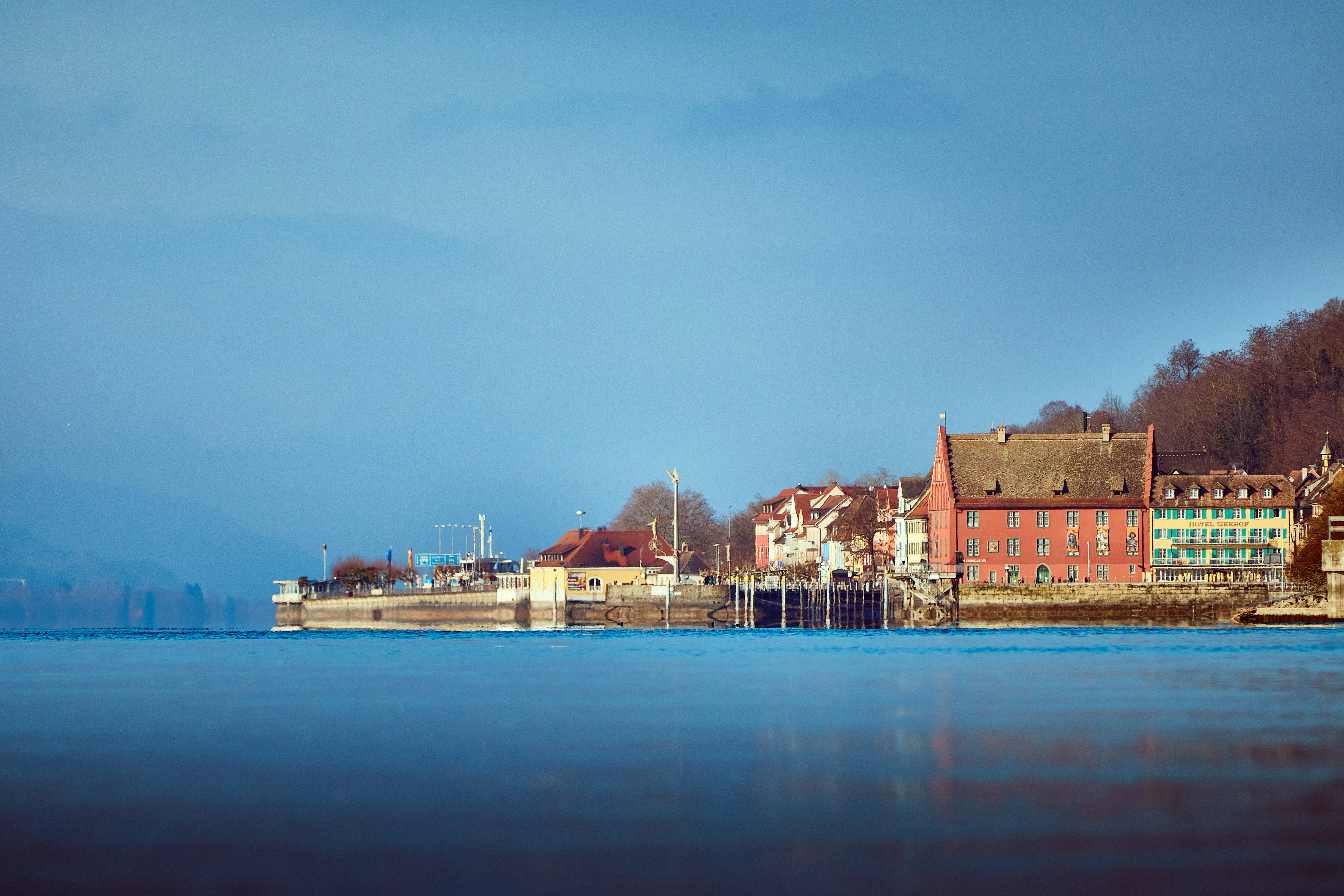 Die malerische Seepromenade mit Schiffsanlegern, Cafes und direktem Blick über den Bodensee zu den Alpen