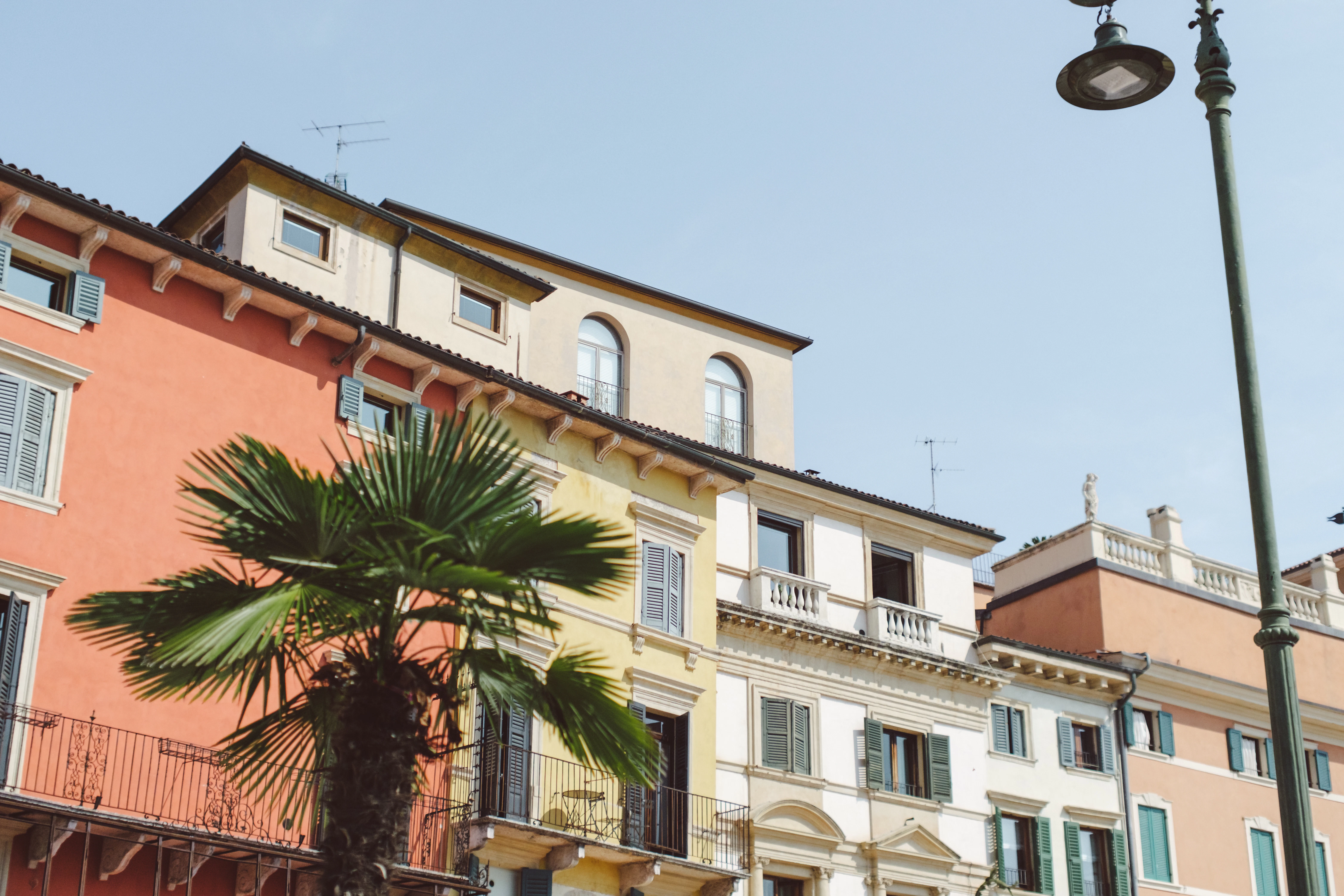 a palm tree in front of a row of multi - colored buildings