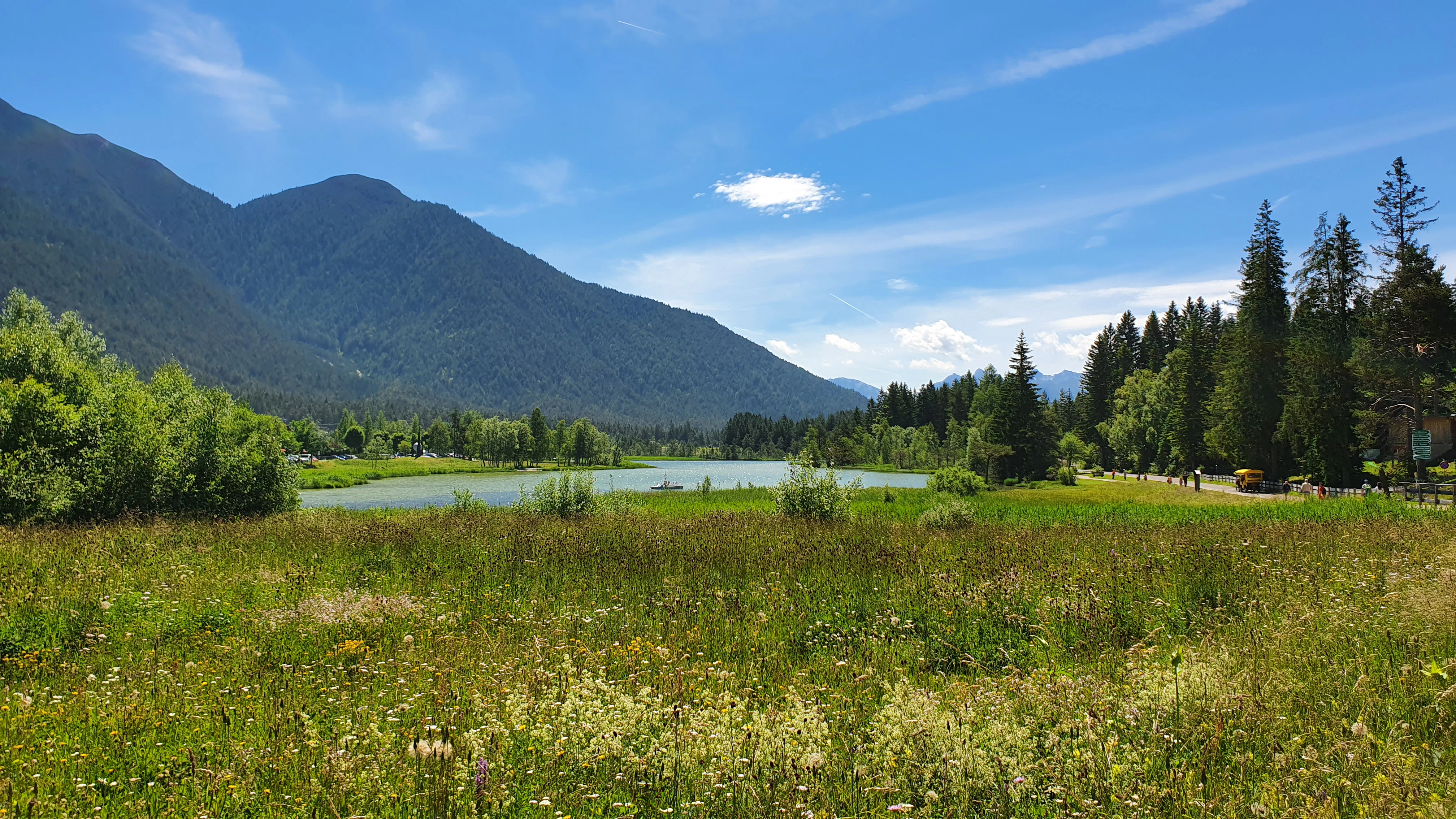 Moorsee oberhalb von Seefeld: türkisfarbenes Wasser inmitten von Fichten, Rundwanderweg und Strandbad im Sommer.