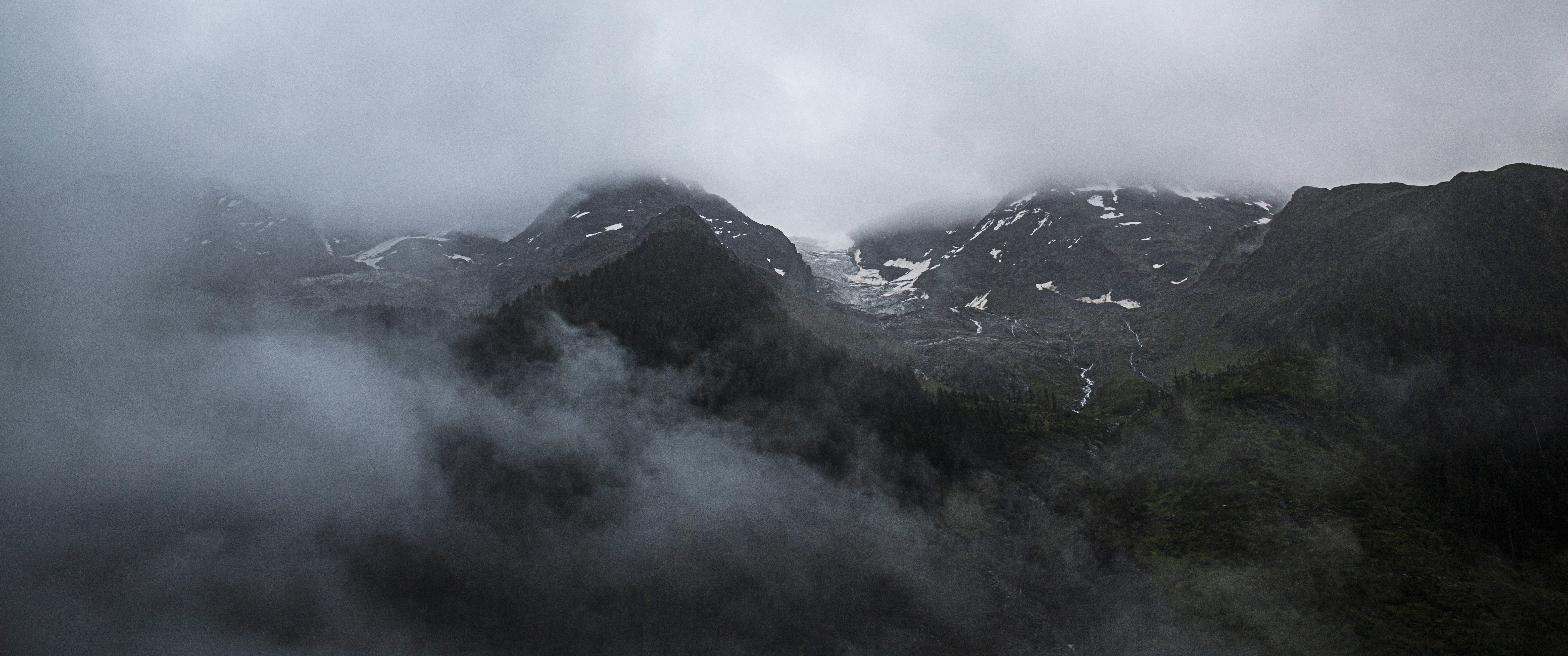 a mountain range covered in fog and clouds